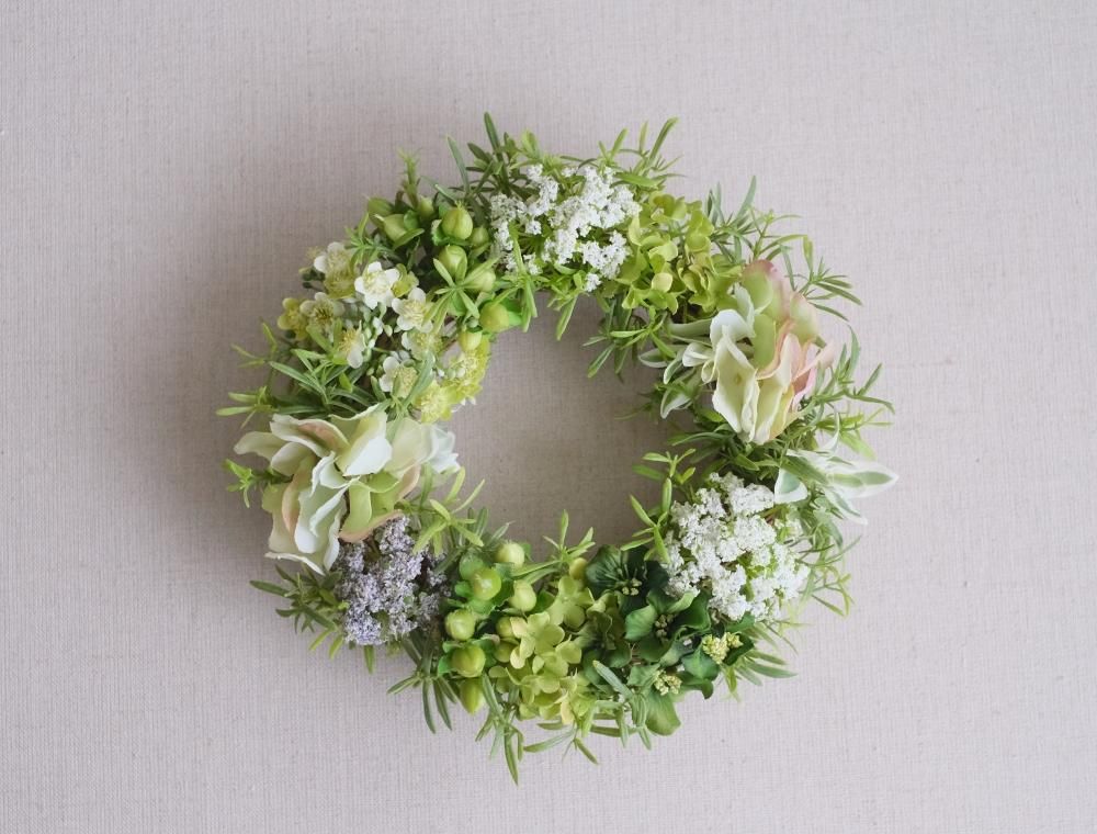 様々なグリーンの素材を使い、楽しいリースを作りました。