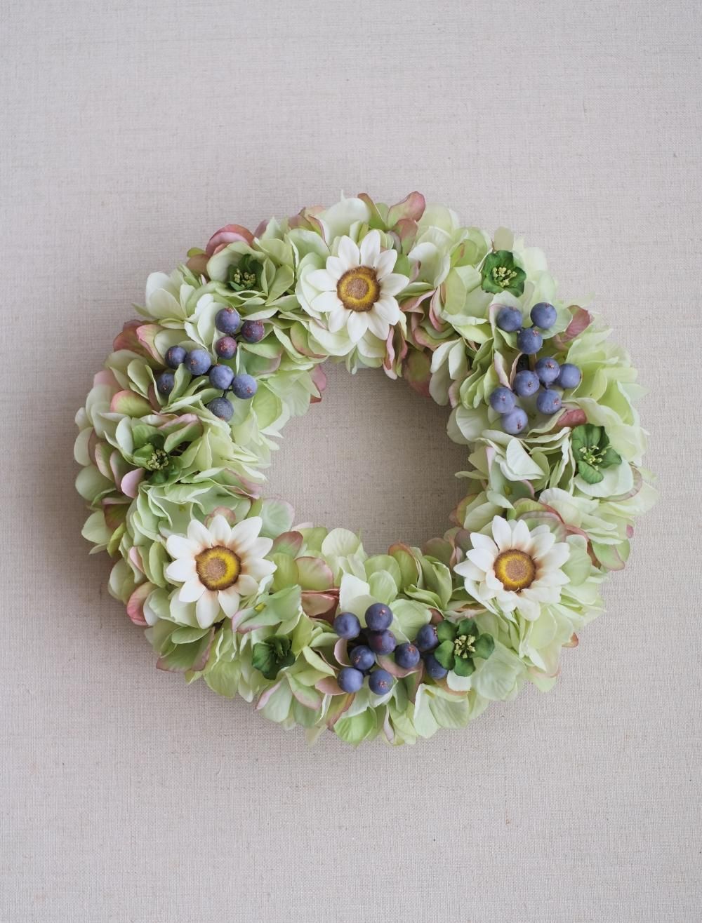 白いひまわりが優しくナチュラルな雰囲気のリースです。