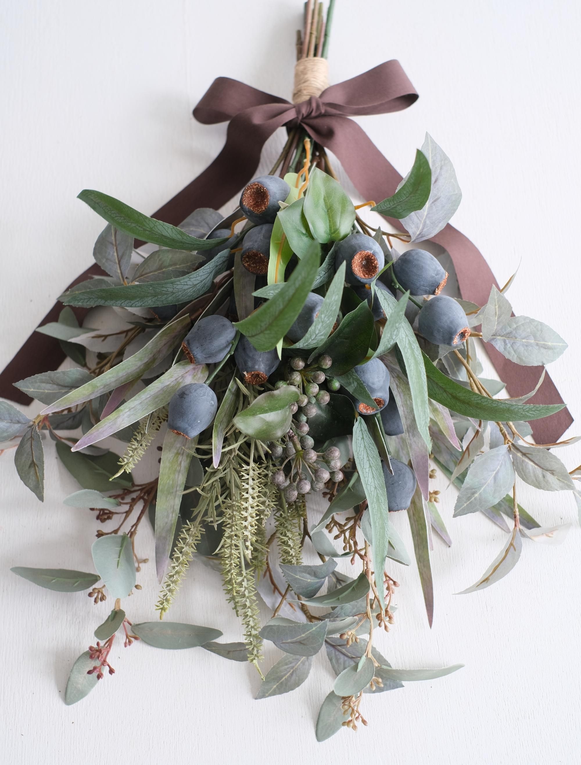 ニュアンスのある葉っぱを数種類ミックスし、ナチュラルな雰囲気に仕上げました。