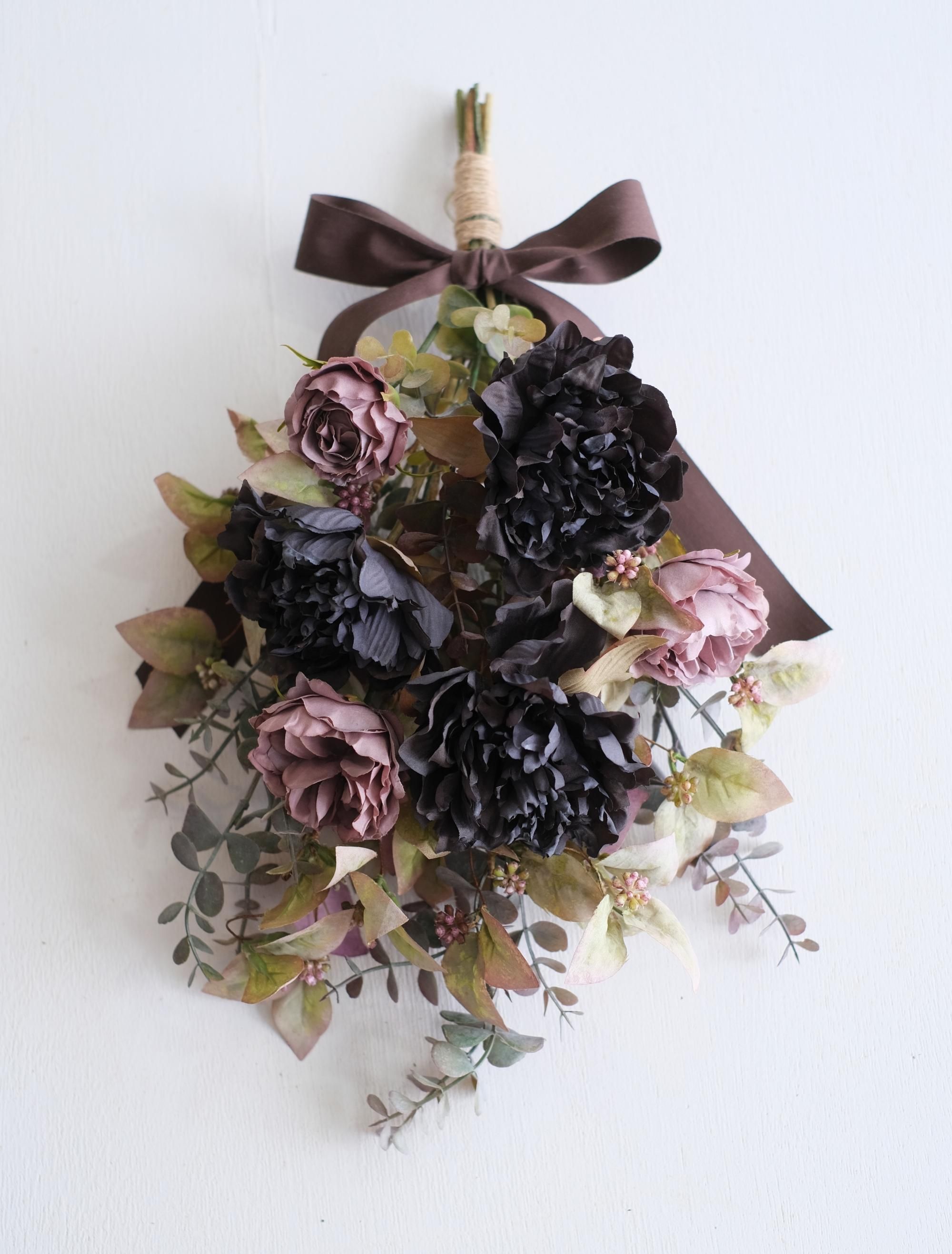 個性的な黒いピオニーに、ふんわりと咲くブラウン系のバラを合わせました。