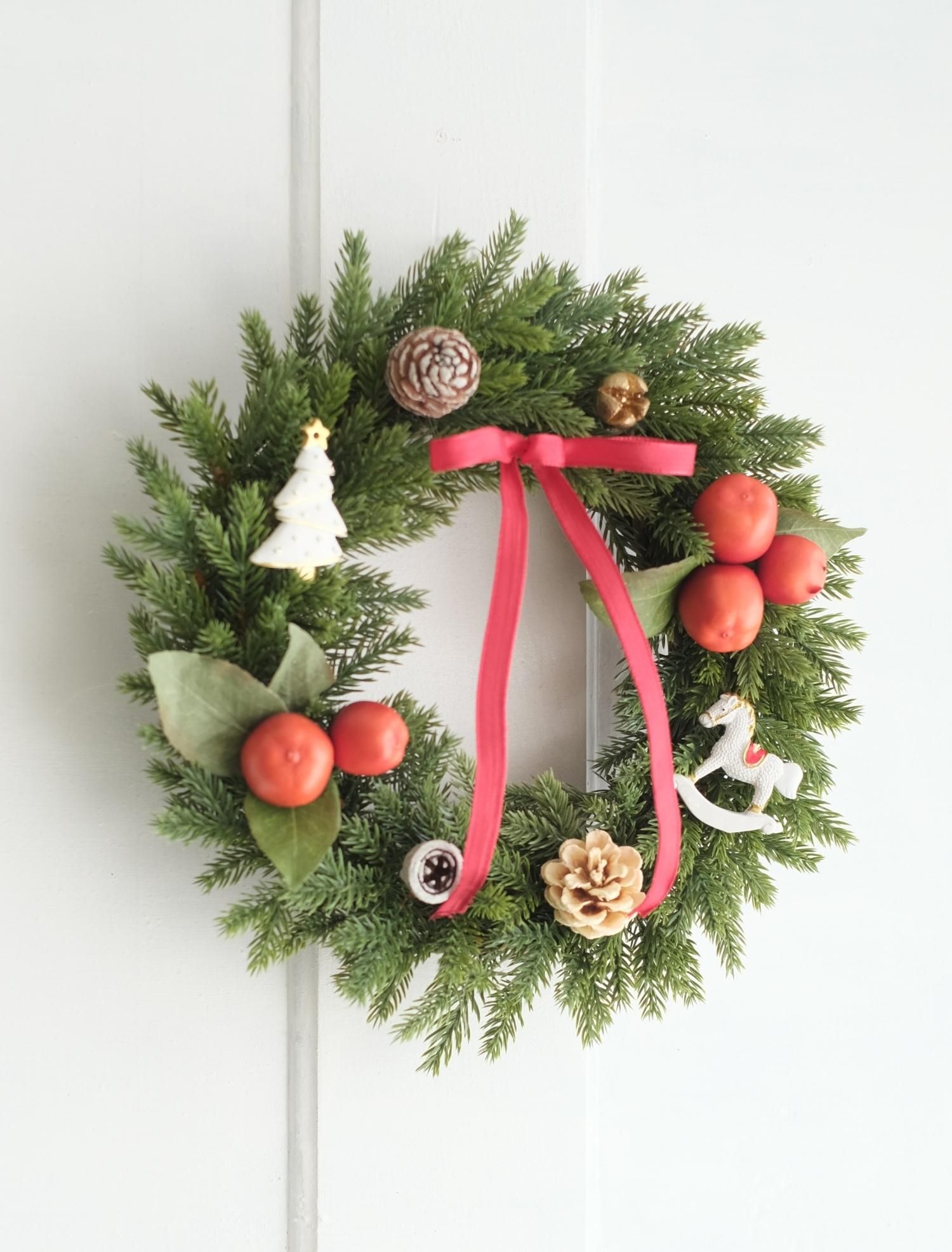 姫りんごと可愛いオーナメントを合わせた、どこか物語を感じるリースです。