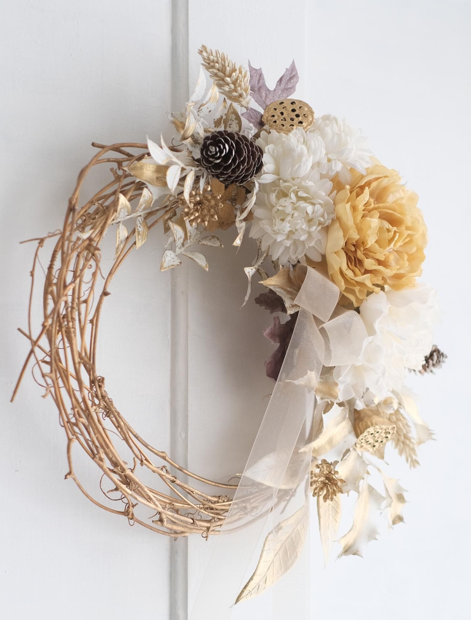 三日月型に広がるシャンパンカラーの花と葉の華やかなリースです。